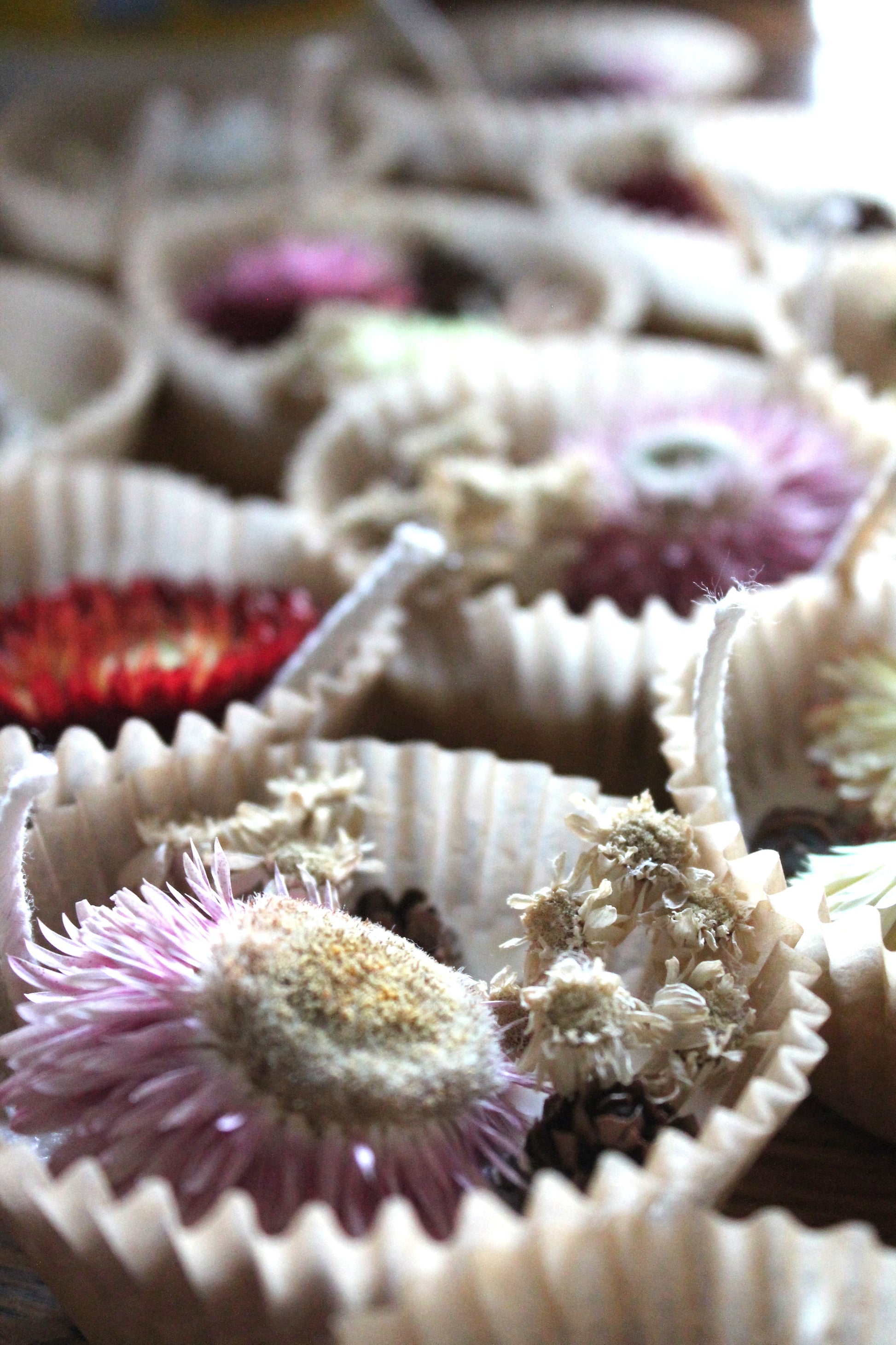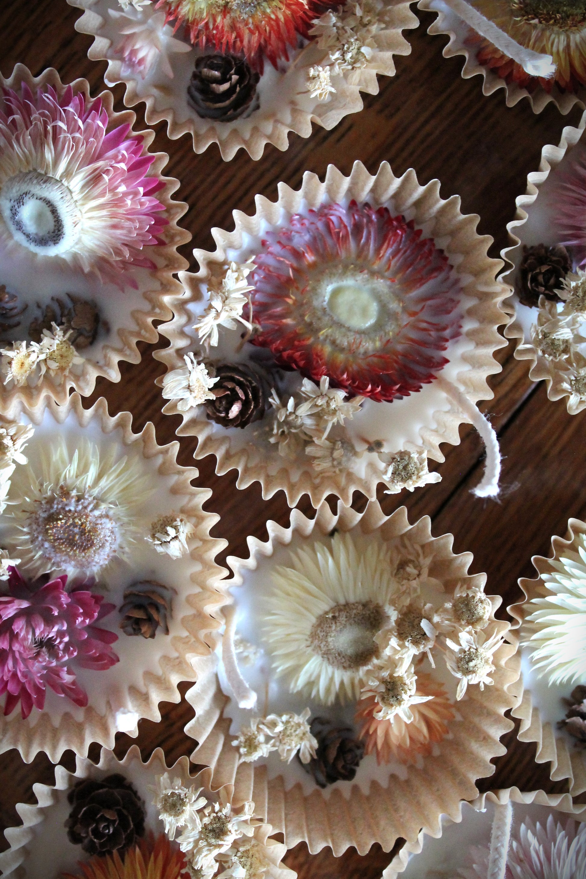 Material: Beeswax, soy wax, coffee filters, paper towels, cotton rags, cotton wicks, cupcake liners, dried flowers and pinecones