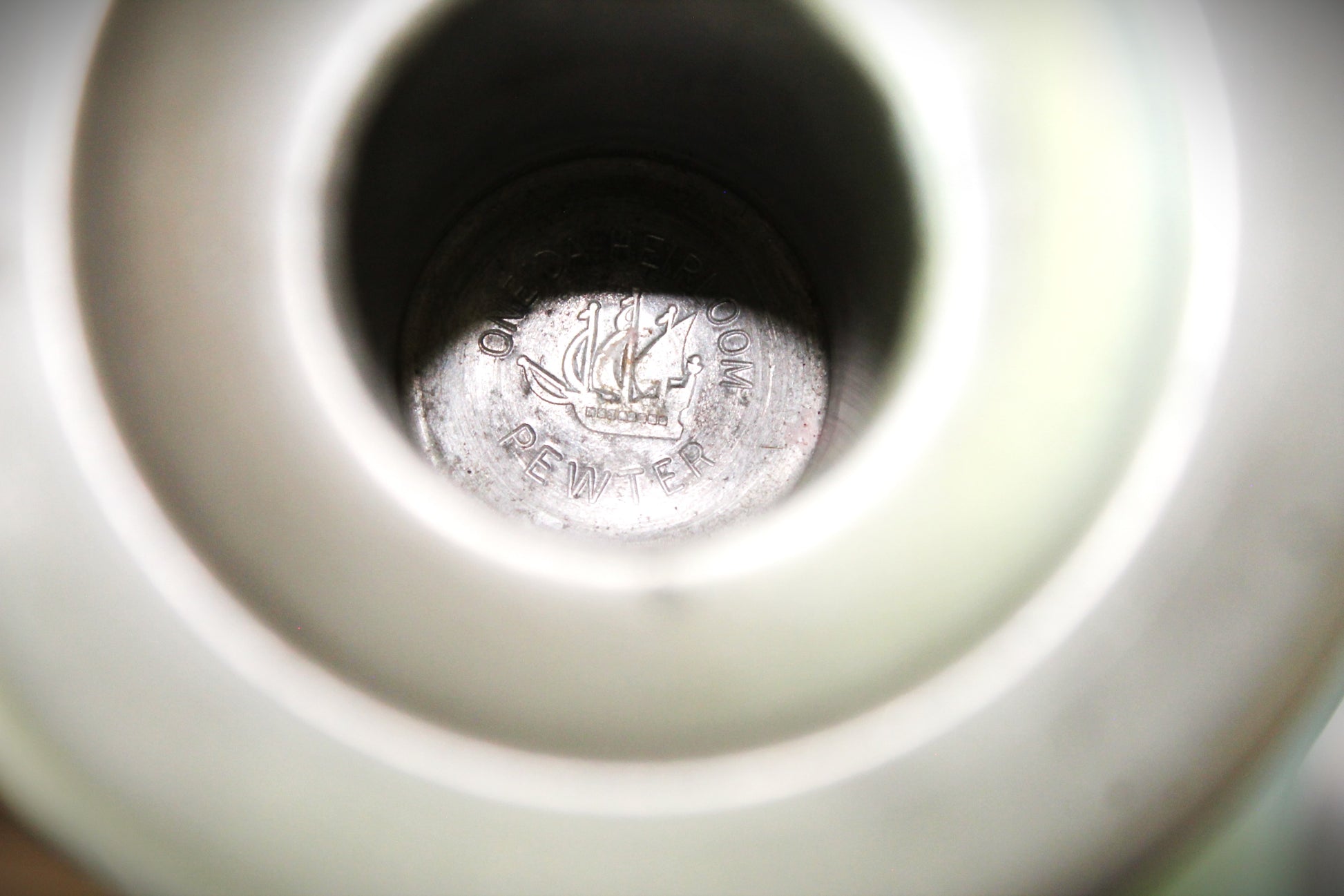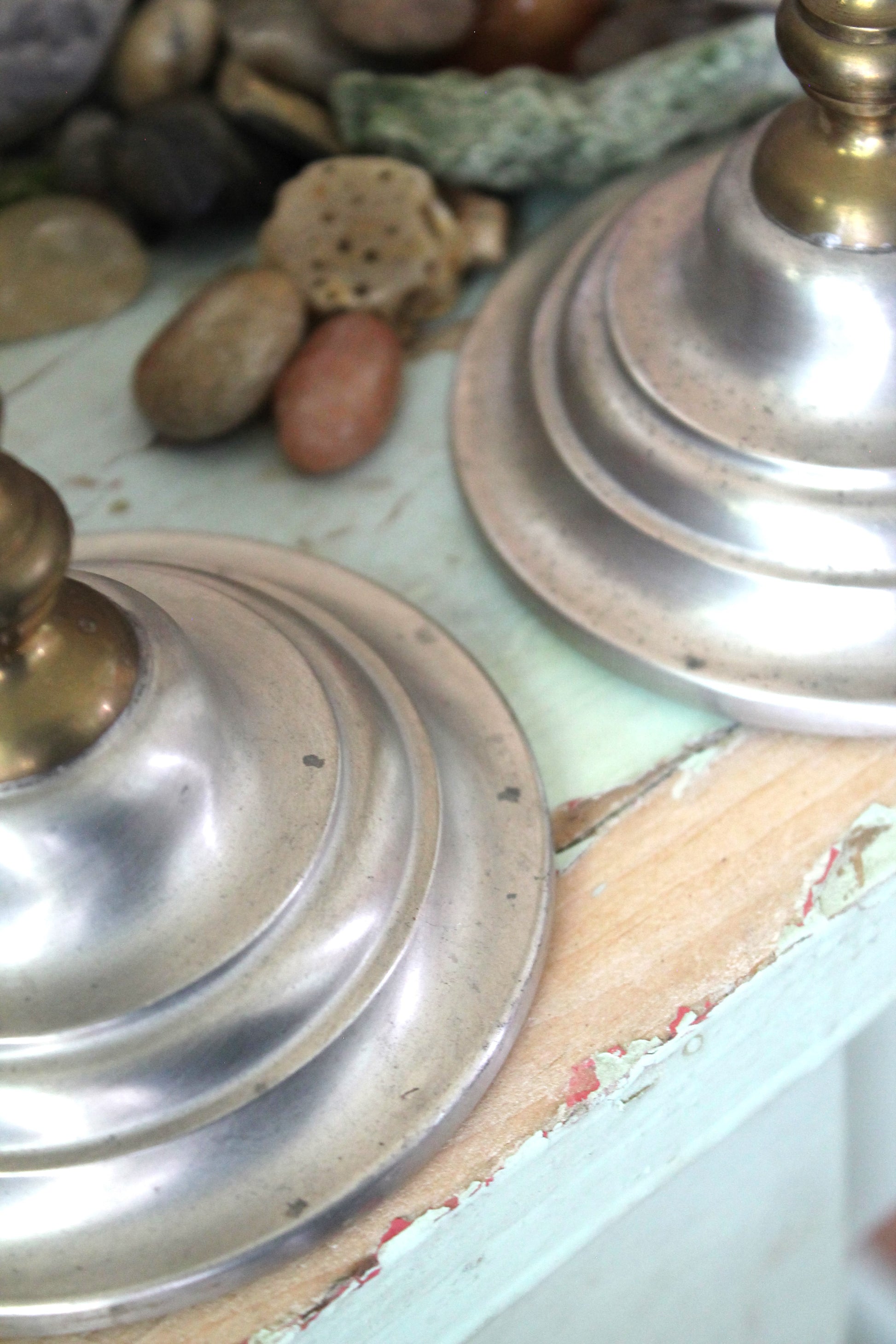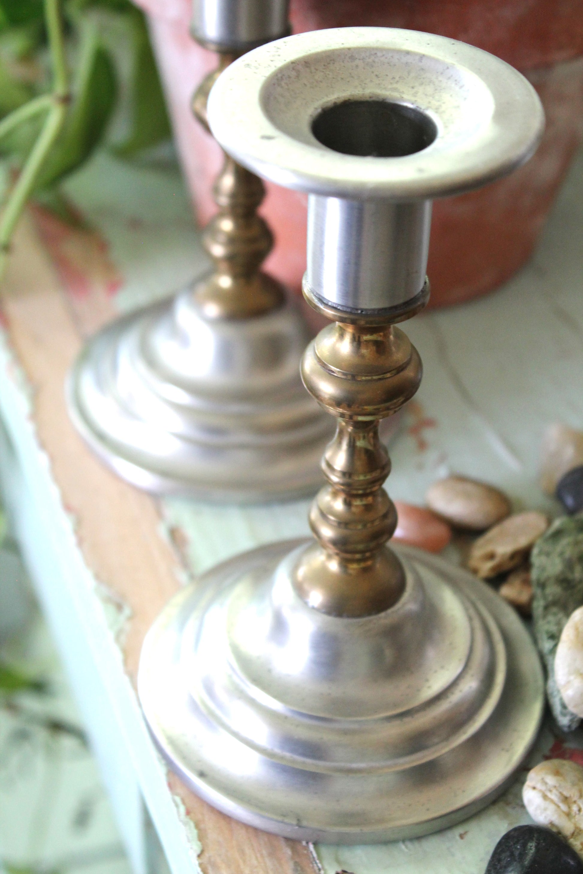 Set of two vintage Oneida Heirloom Pewter and Brass candlestick holders. These are in used condition with some blemished and tarnish. They are 6 inches tall and 3 3/4 inches wide.