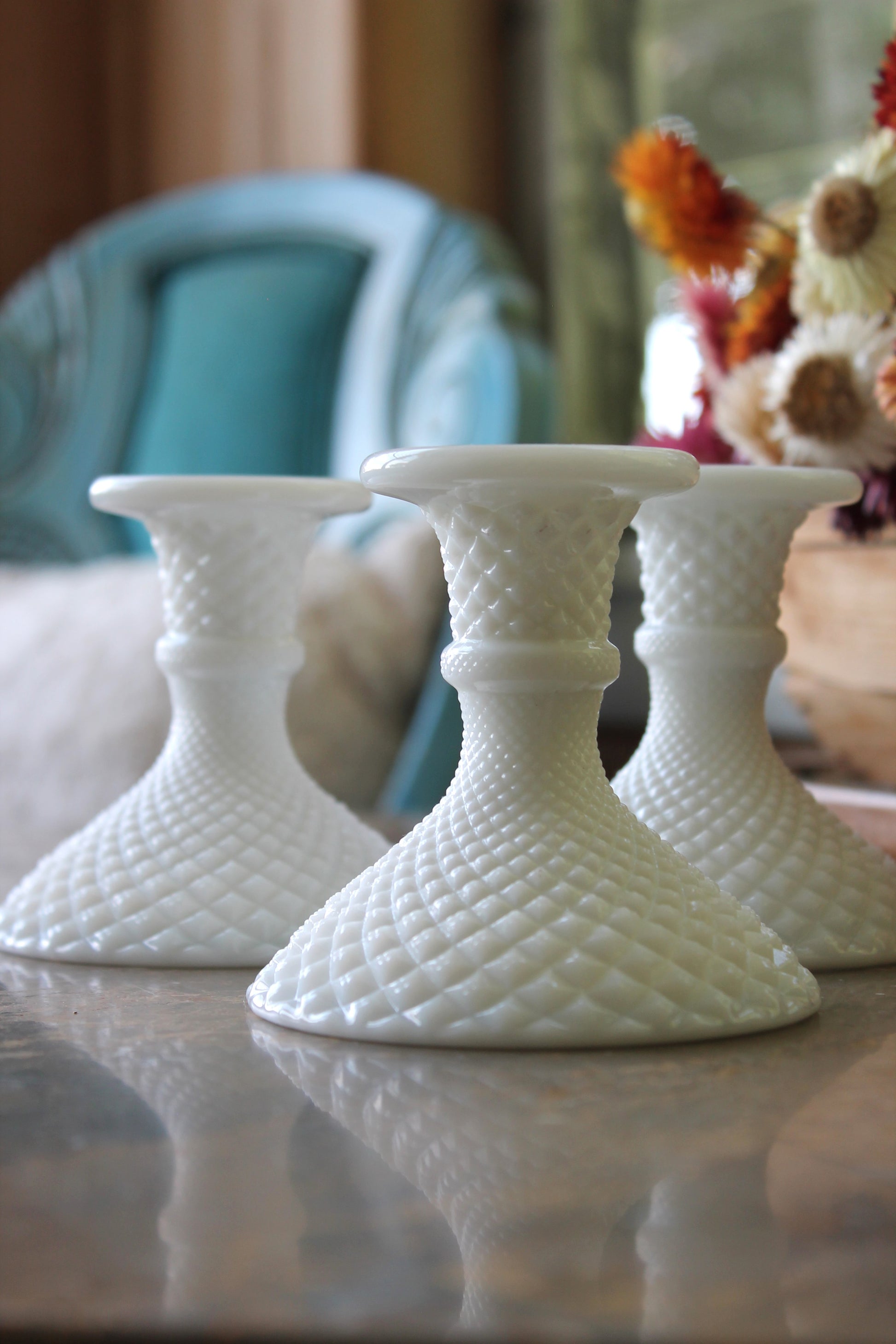 Beautiful set of three vintage milk glass candlestick holders. These are in great used condition with some minor blemishes. they stand at 4 inches tall and the bases are 3 3/4 inches wide.