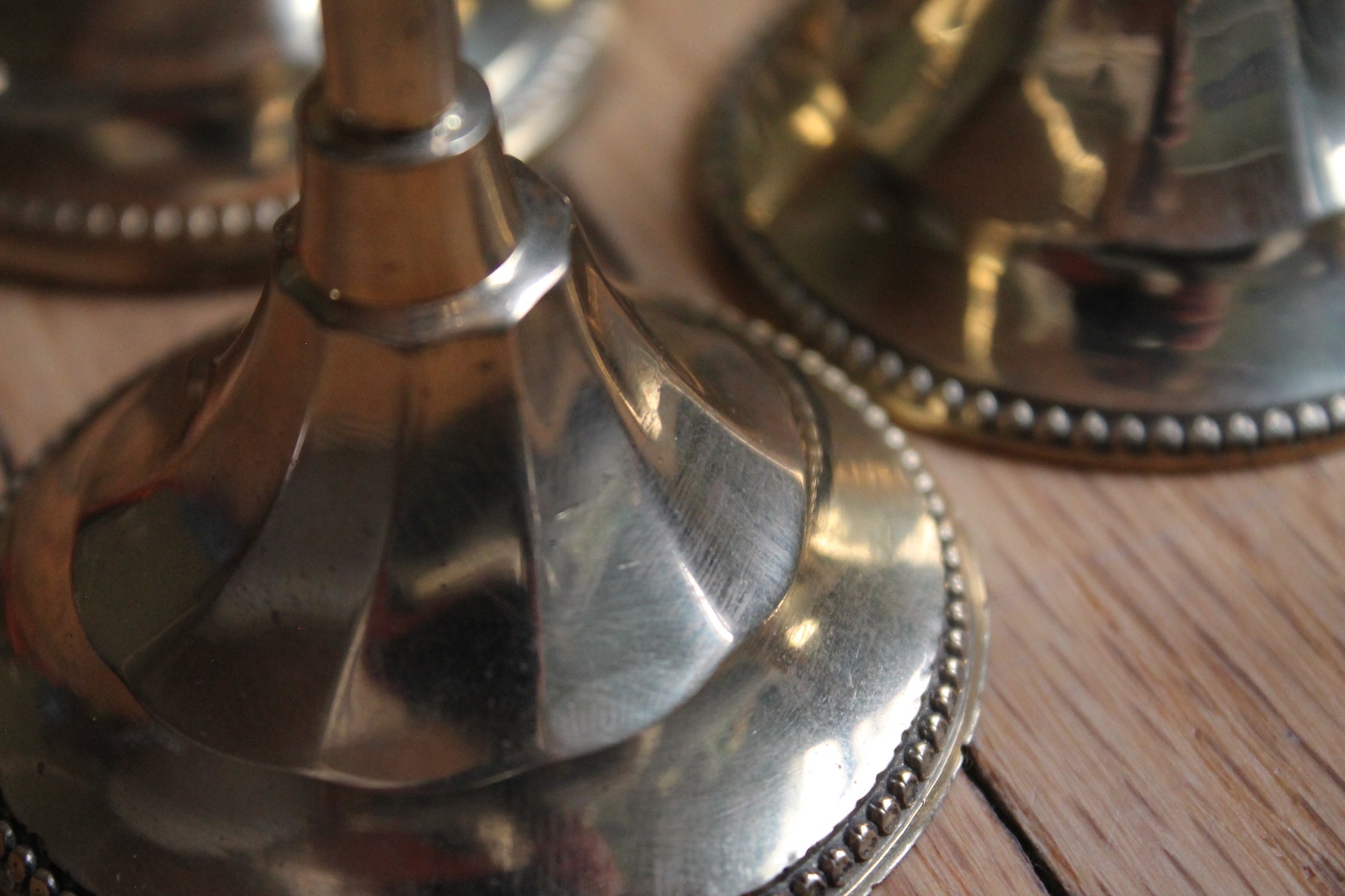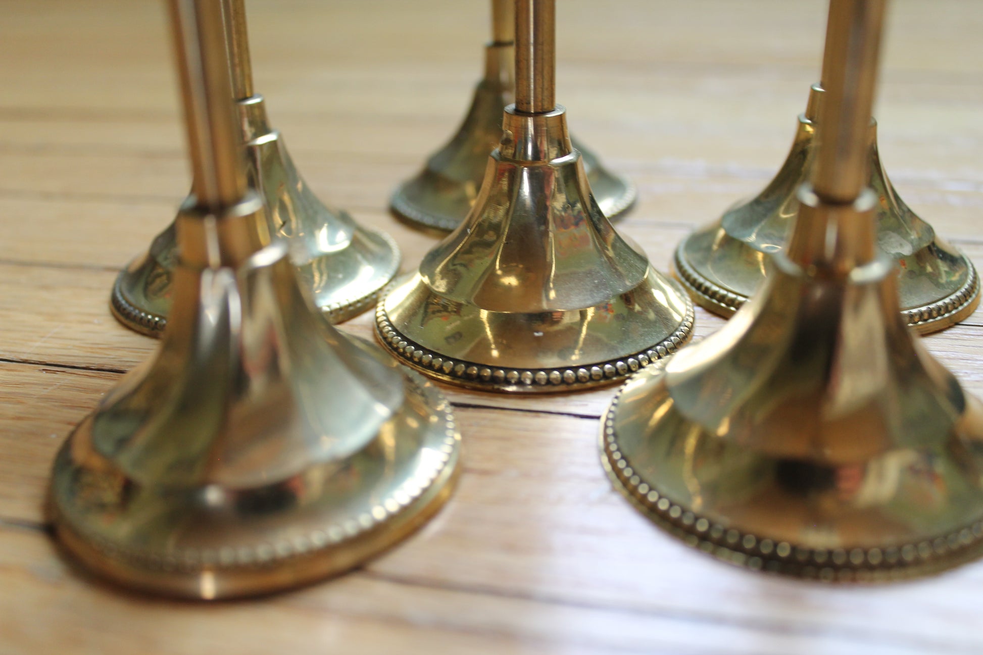 Set of 6 brass candle stick holders. This is in used condition with some blemishes like tarnish and scratches.